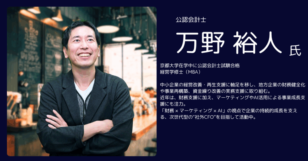 万野氏は公認会計士として大手企業の監査業務を経験したのち、より現場に近い経営課題に向き合いたいという思いから地元・関西を拠点に活動を開始。
